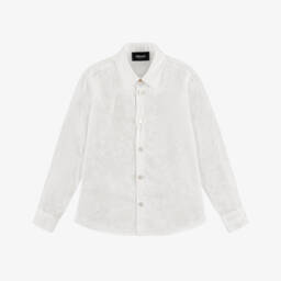 Eye-catching turquoise blue blouse for girls by luxury Italian brand Versace, with a bright and colourful floral print featuring the iconic Greca logo. Silky soft and lightweight, this retro 60's inspired blouse has a classic pointed collar. The front button fastenings include a sparkling gold Medusa top button, with matching buttons on the cuffs.