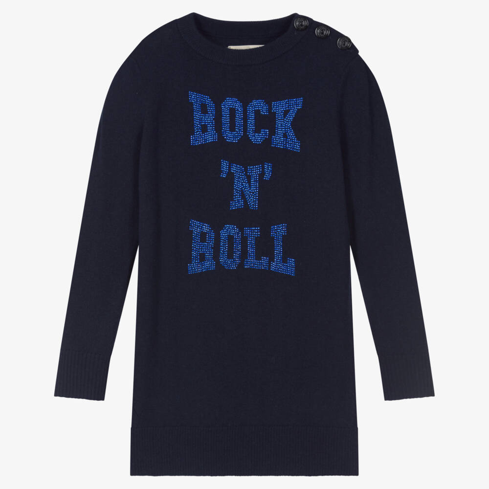 Cool navy blue sweater dress for girls by Zadig&Voltaire, with an urban, edgy 'Rock & Roll' slogan on the front, glittering with contrasting blue studs. It is made in a super soft wool and cashmere blend, making it as comfortable as it is stylish and has ribbed trims for extra cosiness. There are crest buttons on one shoulder for easy dressing.
