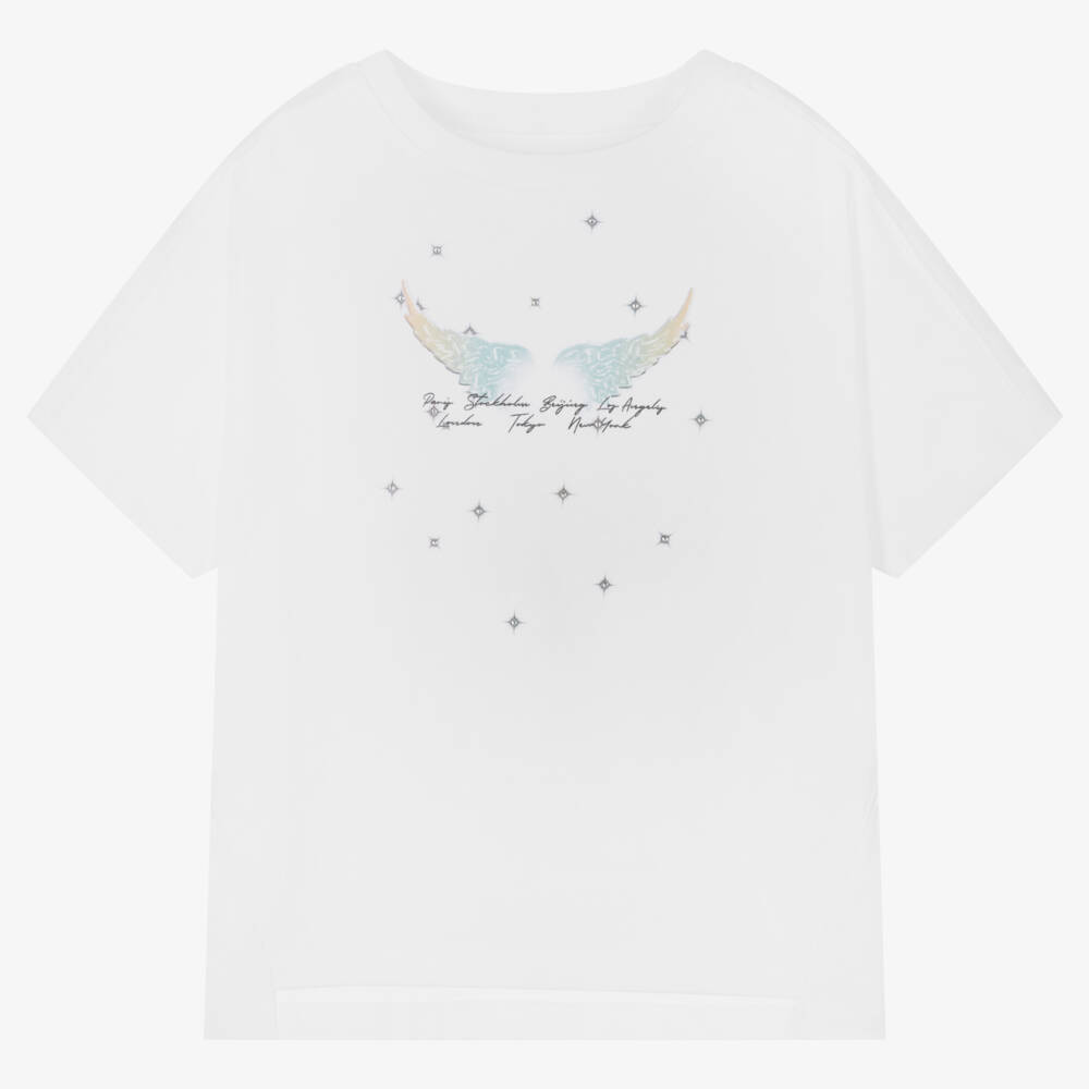 Cool white mini-me T-shirt for girls by Zadig&Voltaire, made from soft organic cotton jersey. On the front is the brand's iconic angel wings motif, alongside the names of famous capital cities, and star-like faux crystal embellishments. The top has a contemporary, oversized fit, with a high-low hemline that is great for tucking in. The crew neckline and seamless, unhemmed sleeves complete the casual style.