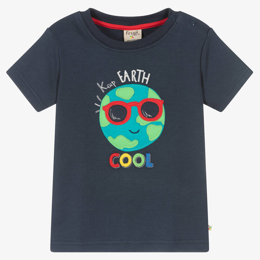 Navy blue T-shirt for boys and girls by British brand Frugi, made in a blend of soft and stretchy organic and recycled cotton. There is a fun blue and green 'Earth' appliqué on the front wearing sun glasses. It has a colourful 'Keep Earth Cool' slogan embroidered around the globe. Smaller sizes have popper fastenings on one shoulder for easy dressing.