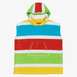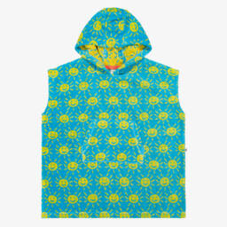 Bright blue pocho towel for boys and girls by Frugi, featuring a cheerful all-over yellow sun print. Made in soft organic cotton towelling, it is warm and cosy, with a large hood and a practical front pocket. Ideal for fun at the beach or pool, it also makes a great cover-up.