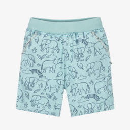 Navy blue organic cotton shorts for boys by Frugi, patterned with embroidered green tractors. Made in lightweight twill, they have useful slanted pockets on the front and an adjustable waistband for a great fit.