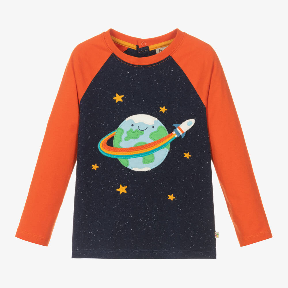 Little boys navy blue and orange top by Frugi. Made in soft organic cotton jersey and GOTS certified, this eco-conscious design has a fun rainbow world embroidered appliqué on the front and popper fastenings on the back.