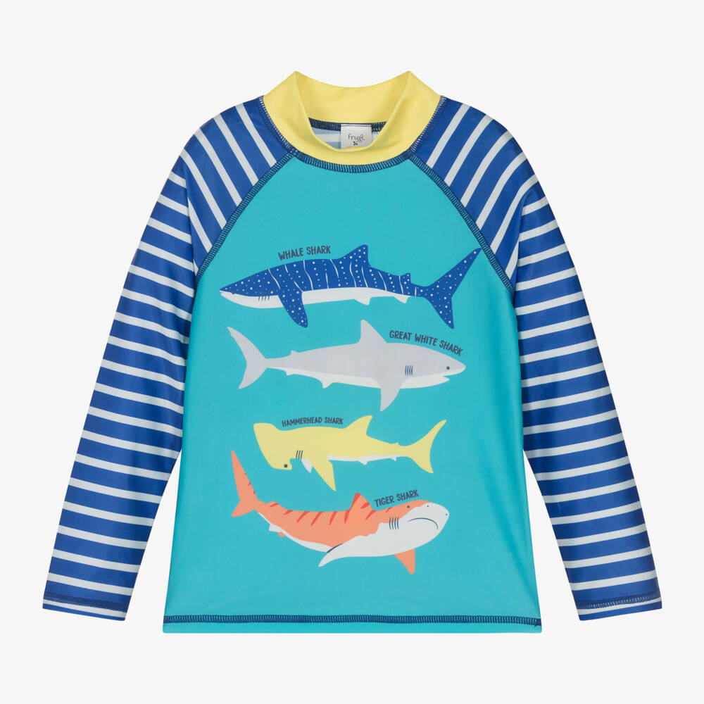 Fun blue sun protective swim top for boys by British brand Frugi, made using recycled, UPF50+ materials. This rash vest has long sleeves and a high neck to provide cover from the sun. The turquoise blue front panel has colourful shark prints and the sleeves and back have a blue and white striped design.