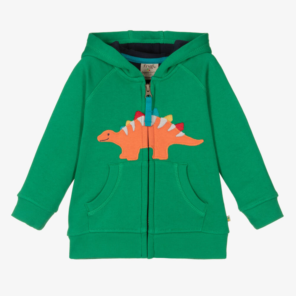 Bright green zip-up hoodie for boys by British brand Frugi, made in soft organic cotton jersey with a fleecy underside. Bold and creative, it has a colourful dinosaur embroidery on the front, cosy pockets and a zip fastening with a blue tab on the front.