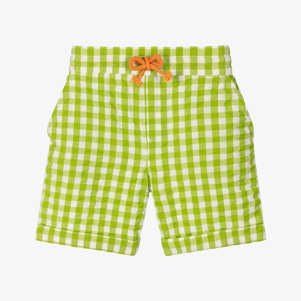 Summery green gingham shorts for boys by Frugi, made in cool, lightweight organic cotton seersucker. They have a semi-elasticated, drawstring waistband for a great fit, cute, fixed turned-up cuffs and useful pockets on both the front and back.