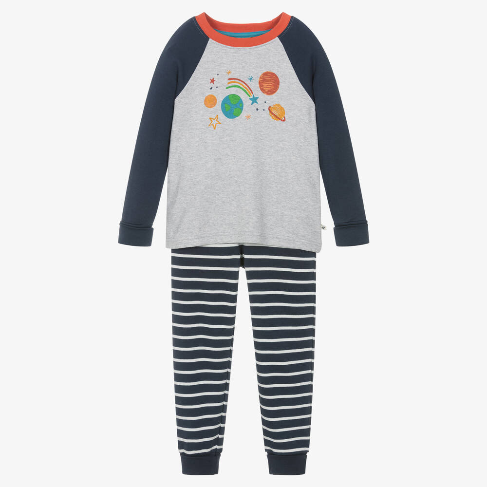 Made from soft organic cotton jersey, these navy blue and grey pyjamas for boys are designed by Frugi. The raglan-style top has a graphic, colourful space print on the chest. It comes with navy blue striped pyjama bottoms, with an elasticated waist for bedtime comfort.