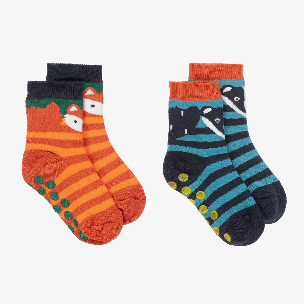 Orange and blue socks for little boys by Frugi, made in a soft and stretchy organic cotton knit. Warm and cosy, the orange striped socks have a cute fox design and the blue striped socks have a cute badger design. Both pairs have useful rubber grips on the soles to prevent slipping.