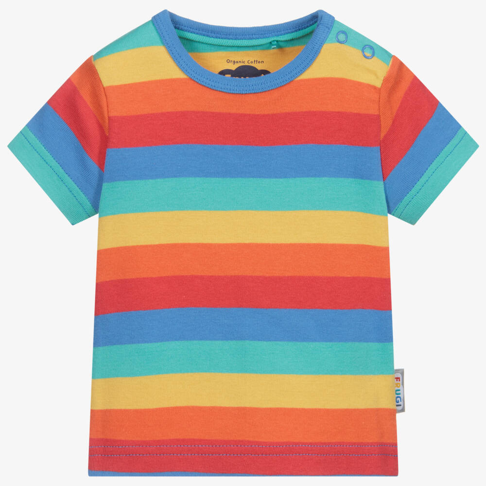 Bright rainbow striped T-shirt for boys by Frugi, in vibrant red, yellow, green and blue shades. It is made in soft and stretchy organic cotton jersey for comfortable, everyday wear. Smaller sizes have popper fastenings on one shoulder.