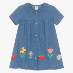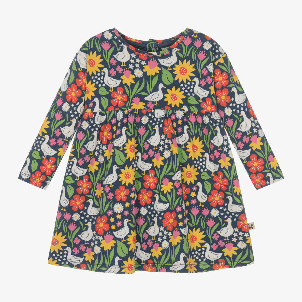 A lovely blue organic cotton dress for little girls by Frugi, patterned with colourful flowers and sweet ducks in yellow, red and white. Made in soft and comfortable jersey, this easy-to-wear style has a full skirt and popper fastenings on the back for a neat finish.