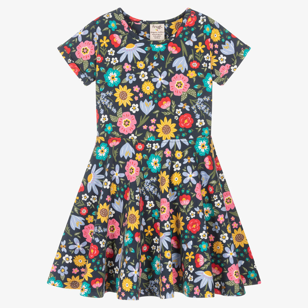 Pretty navy blue skater dress for girls by British brand Frugi, made in soft and stretchy organic cotton jersey. Comfortable and easy wearing, it has a colourful floral pattern and a full circular skirt. There is a small logo tab on one side seam and useful popper fastenings on one shoulder on smaller sizes.