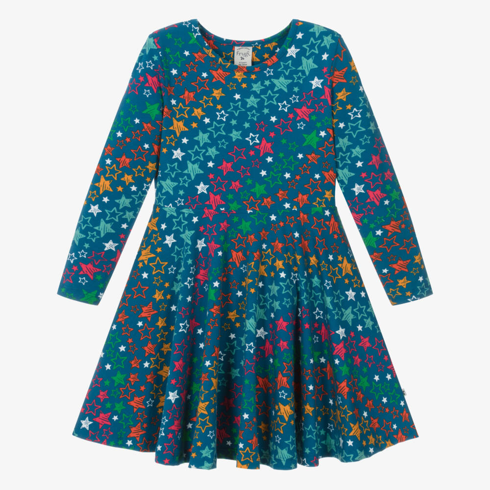 Vibrant blue long-sleeved skater dress for girls by British brand Frugi, with a colourful star pattern. Made in soft and comfortable organic cotton jersey, this easy-to-wear style has a full circular skirt, just right for twirling. For a branded touch, there is a small logo tab on the side seam. Smaller sizes have popper fastenings on one shoulder to help with dressing.