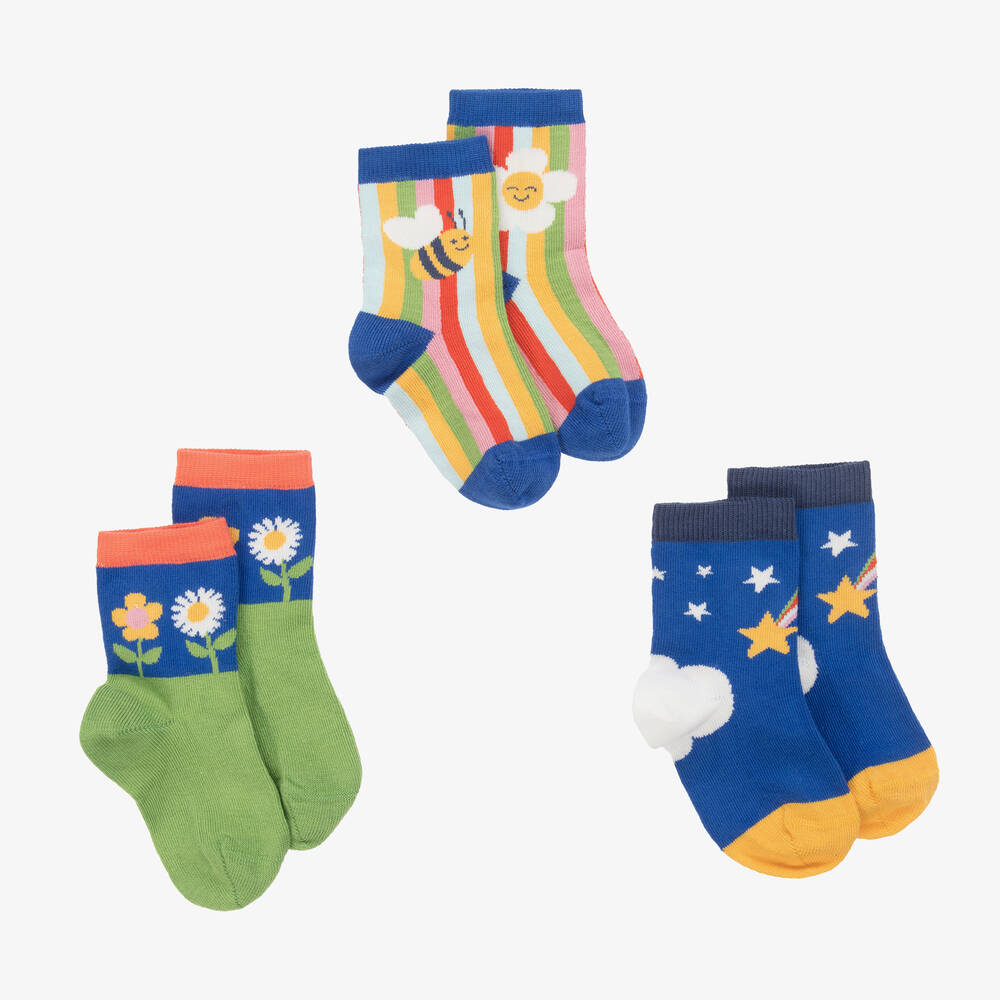 A lovely pack of three pairs of ankle socks for girls by Frugi. In shades of blue and green, these fun and colourful socks have garden-inspired designs, featuring flowers, bees and stars. Soft and comfortable to wear, they are made from a stretchy organic cotton knit.