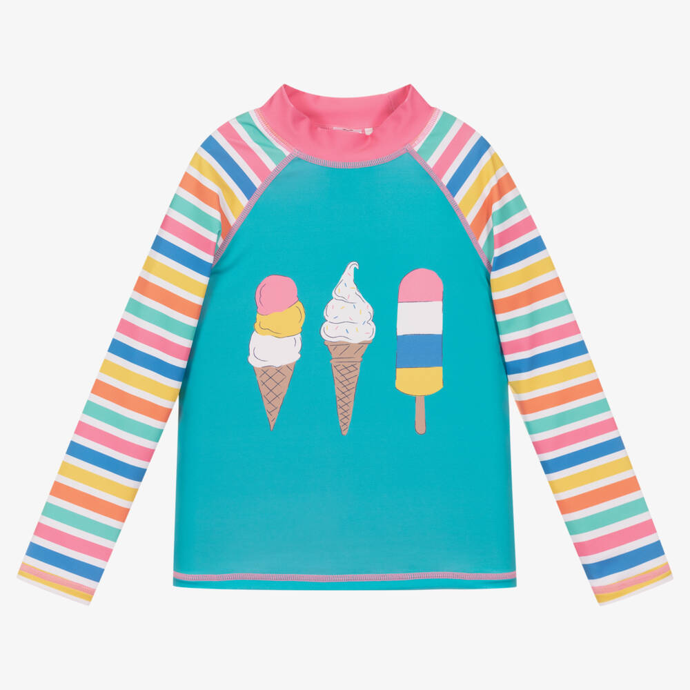 Vibrant blue and pink swim top for girls by British designer Frugi, with a smooth UPF 50+ sun protective exterior. This fun rash vest has a delicious ice cream print on the front, long rainbow striped sleeves and a high neckline.