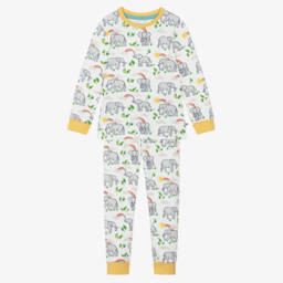 Navy blue pyjamas for girls by Frugi, made in soft, comfortable organic cotton jersey. The top has a super sweet unicorn, flowers and night sky appliqués on the front, with popper fastenings on one shoulder for speedy dressing. The coordinating ivory trousers have a colourful unicorn and floral pattern with an elasticated waist that is gentle on little tummies.