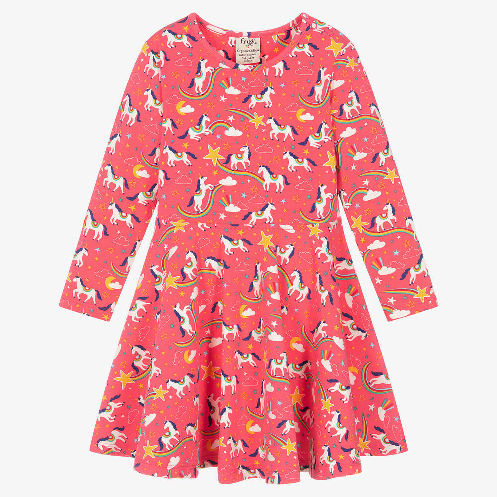 Pretty pink long-sleeved skater dress for girls by British brand Frugi, made in soft and stretchy organic cotton jersey. Comfortable and easy wearing, it has a colourful unicorn, star and rainbow pattern and a full circular skirt. There is a small logo tab on one side seam and useful popper fastenings on one shoulder on smaller sizes.
