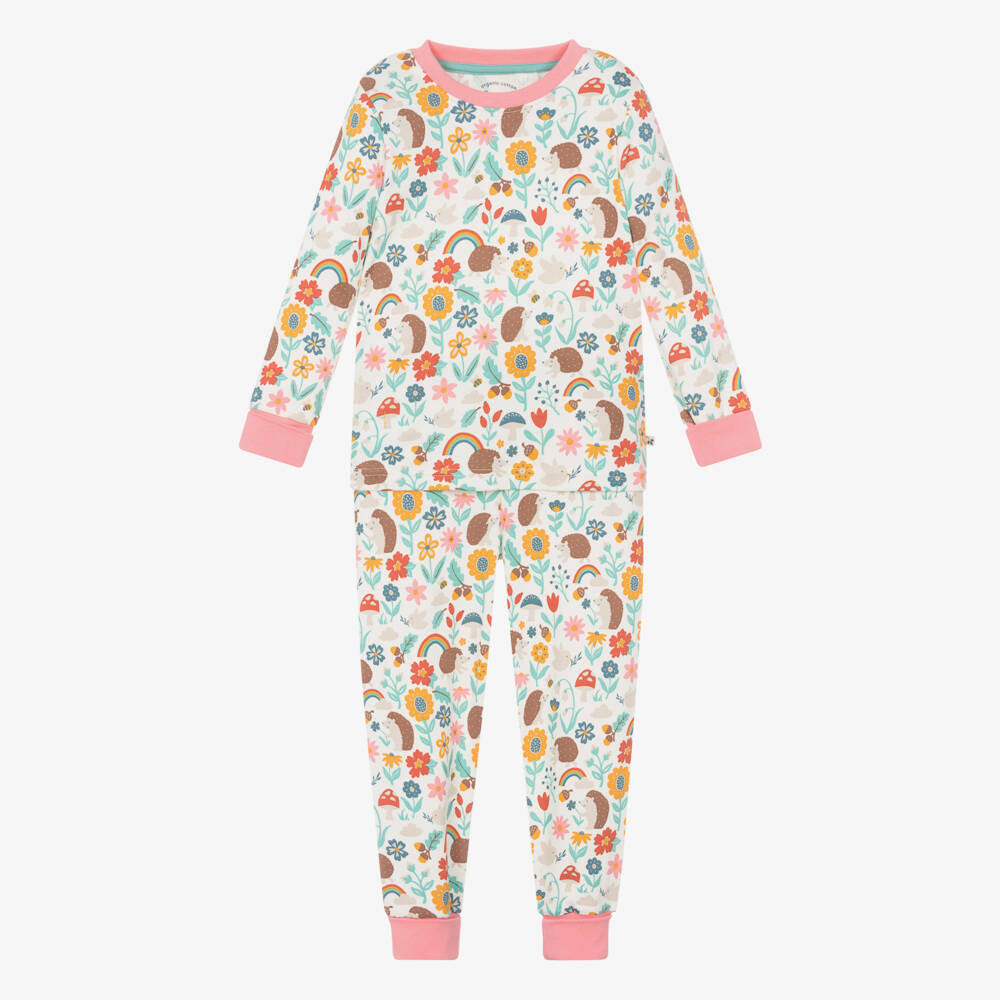 Pretty ivory pyjamas for girls by British brand Frugi, with a colourful woodland pattern featuring cute hedgehogs. Made in soft organic cotton jersey that is gentle against the skin, they have been thoughtfully designed with pink ribbed, extendable cuffs to allow for growing room. The trousers have a gently elasticated waistband, just right for a comfortable night's sleep.
