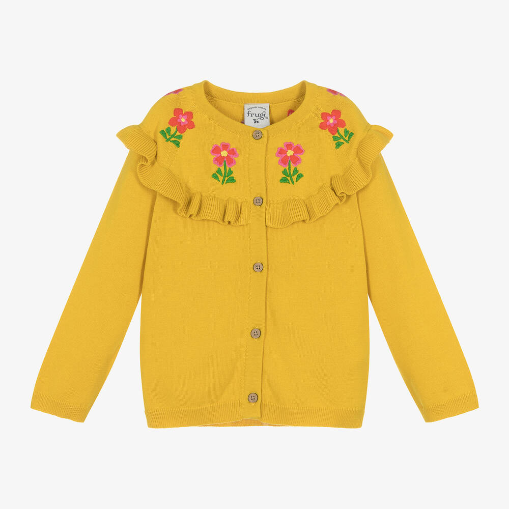 Knitted in soft organic cotton, this lovely mustard yellow cardigan for girls is by Frugi. Ideal for layering, it has a pretty ruffle trim detailed with floral embroidery in pink, red and green and long sleeves. It fastens neatly on the front with wood-effect buttons.