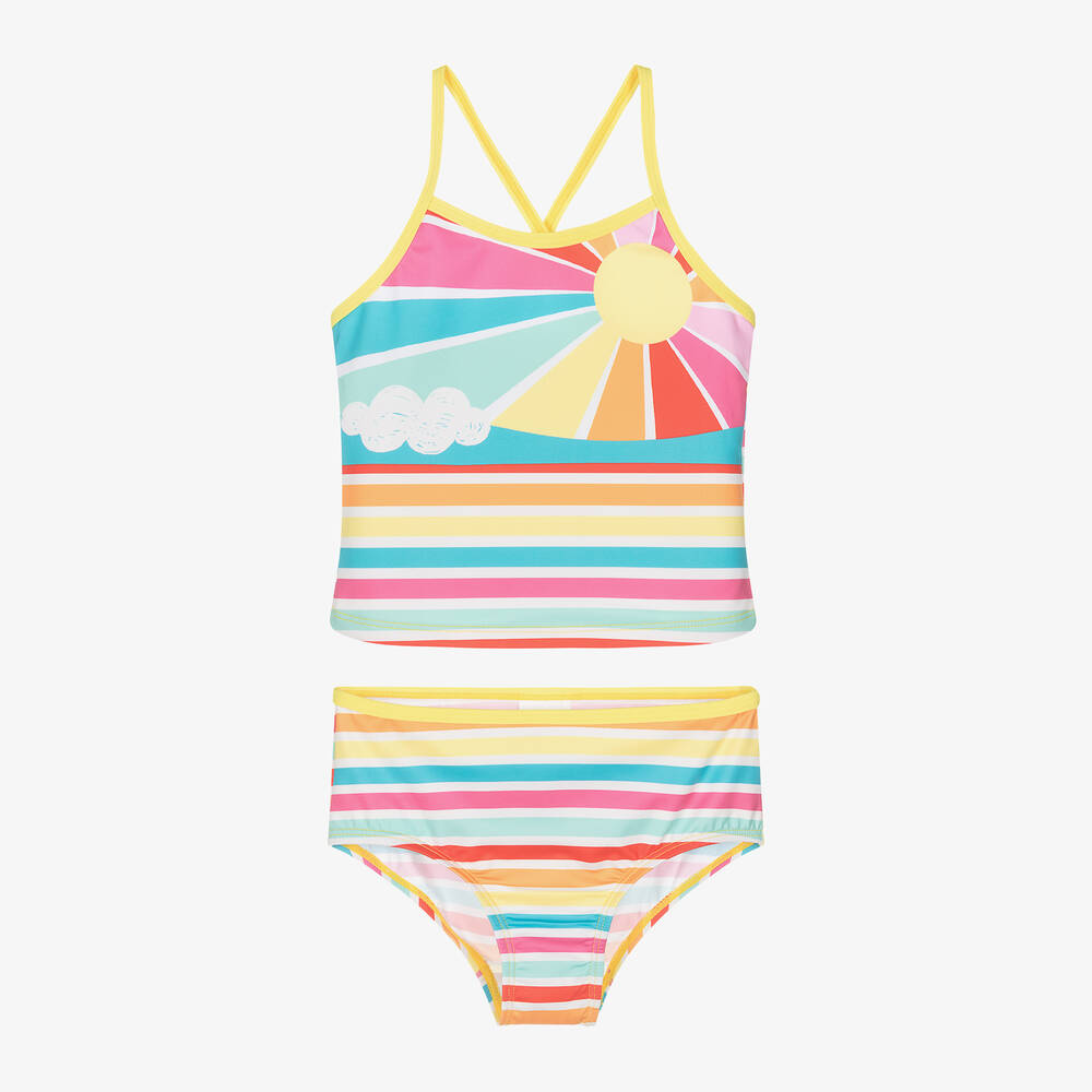 Yellow, pink and blue striped tankini for girls by British label Frugi. Lined with soft material on the front, both are made in silky and stretchy, recycled fabric. The top has cross-over shoulder straps and a fun print of a sun and cloud on the front. the coordinating bottoms have a stretchy waist for simple dressing.