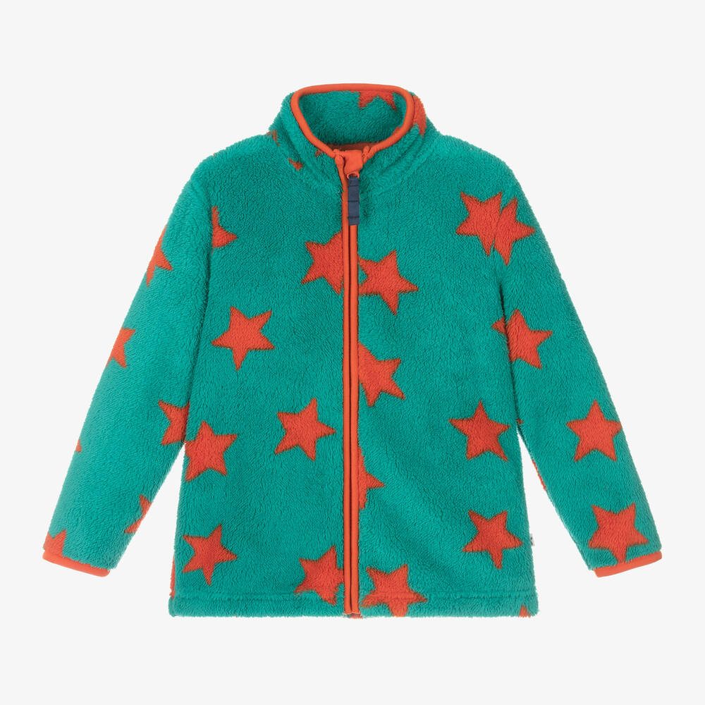 Cute teal green zip-up fleece jacket for boys and girls by British brand, Frugi. Cosy and soft against the skin, this outerwear piece is patterned with vibrant orange stars and has striking orange piped trims.