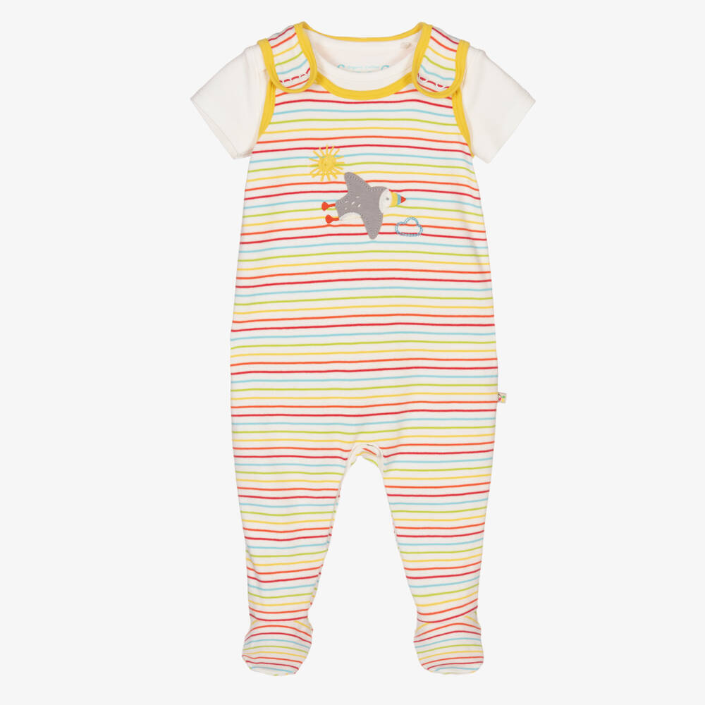 A lovely ivory babysuit set for boys and girls by Frugi, made in soft organic cotton jersey. The dungaree-style babygrow has colourful stripes and a cute puffin appliqué on the front, with popper fastening straps. The ivory bodyvest has an envelope neck and popper fastenings between the legs.
