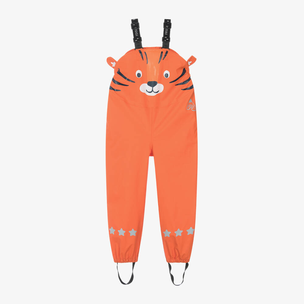 Orange rain trousers for boys and girls by Frugi, with a friendly tiger face on the front. Made in smooth, recycled fabric with welded seams, these waterproof trousers are great for exploring on those rainy days. They have elasticated logo straps and side popper fastenings, both adjustable for a great fit. There are light-reflective logos and stars to aid visibility and the adjustable, removable, button-on stirrups help keep the trousers tucked into rain boots.