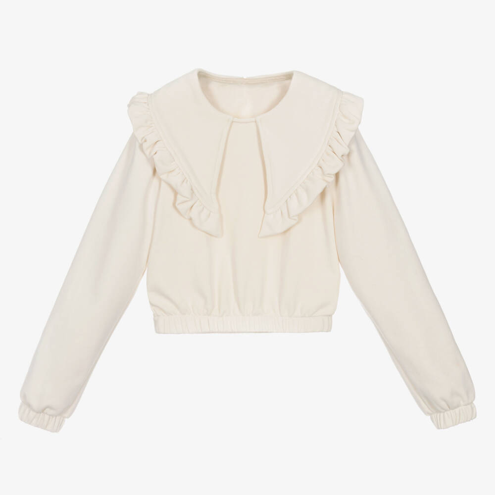 A beige cotton-blend sweatshirt with a difference for girls by Italian brand Fun & Fun, with a stylish, wide, ruffle-trimmed collar. Made in soft, sweatshirt jersey, it has softly elasticated cuffs and a matching hemline for day-long comfort on relaxed days.