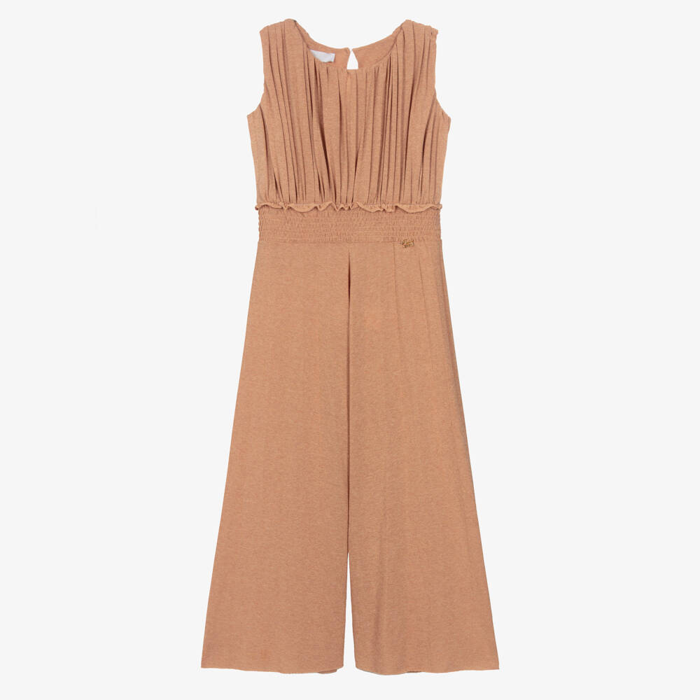 Simple and elegant wide leg jumpsuit for girls by Fun & Fun, in an on-trend, neutral shade of beige. Made in soft and stretchy viscose jersey, this sleeveless style has a touch of sparkle for a glamorous look. The waist is shirred to created a lovely, feminine shape, and has a shiny gold logo charm sewn below for a discreetly branded touch. There is a keyhole button fastening on the back.