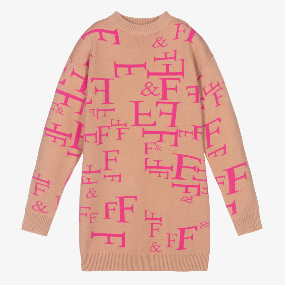 Stylish beige sweater dress for girls by Fun & Fun, knitted from a soft viscose blend. It has a ribbed crew neckline and an all-over fuchsia pink logo pattern.