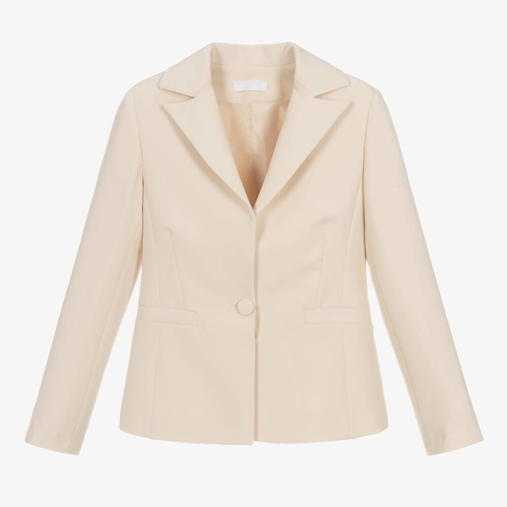 Smart light beige blazer for girls by Italian brand Fun & Fun, made in soft, mid-weight twill. Just right for special occasions or for dressing-up jeans on more relaxed days, it is slightly fitted, with a single, fabric-covered button fastening and faux pockets on the front. It has a silky beige lining for comfort.