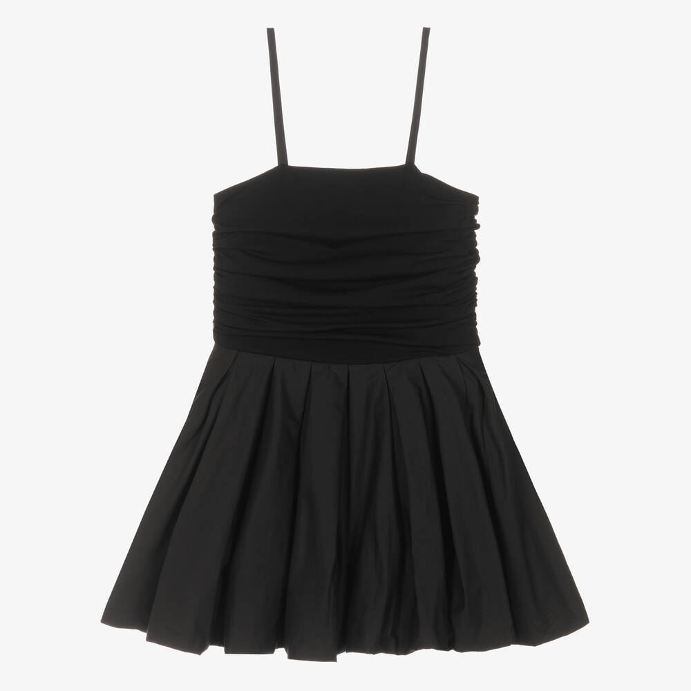 An elegant black dress for girls by Fun & Fun. The bodice is made in stretchy cotton jersey with ruching detail at the sides and a shirred back and thin shoulder straps. There is a pleated puffball-style skirt with an elasticated hem and a jersey lining for comfort. Ties at the waist to secure in a bow at the back.