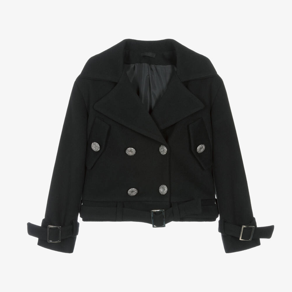 Smart black jacket for girls by Italian brand Fun & Fun, with eye-catching grey button fastenings sparkling on the front and pockets. Made in a super soft viscose blend, it has stylish, wide lapels, a detachable belt with a sliding silver buckle and matching buckle fastenings on the cuffs for a great fit. It is fully lined in silky satin for comfort.