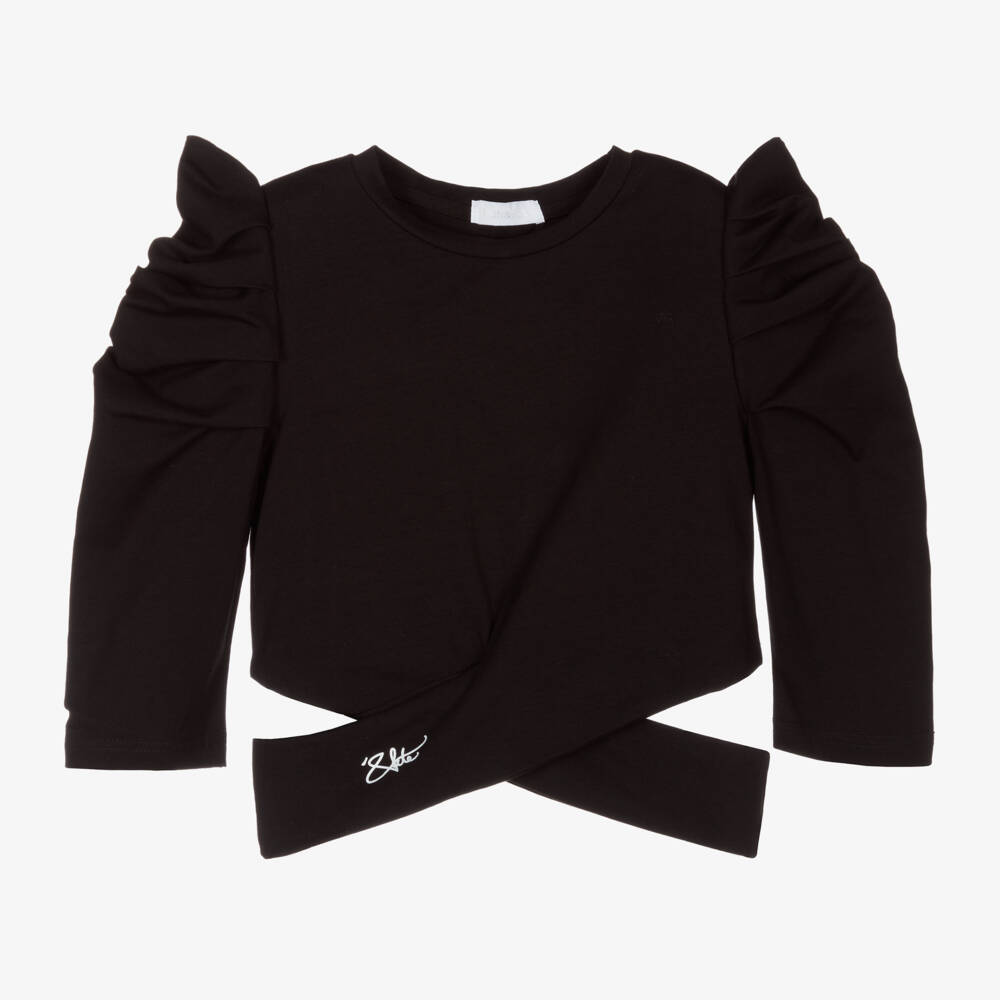 A stylish black top for girls by Fun & Fun, made in soft, stretchy cotton jersey. It has 3/4 length puffed pointed sleeves, with an unusual crossover waistband. There is a white signature logo on the front.