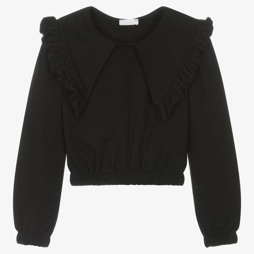 A stylish black sweatshirt for girls by Fun & Fun Chic, made from a soft cotton jersey blend. It has a voluminous collar with ruffled edges and elasticated trims for a pretty silhouette.