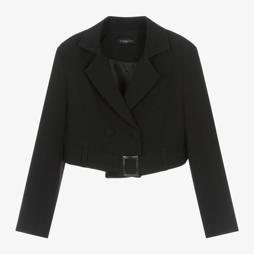 A black cropped blazer for older girls by Fun & Fun, great for a smart-casual look. This cool double-breasted style has a revere collar, covered button fastenings, and a detachable belt with a silver buckle on the hemline for a stylish finish. Decorated with button embellishments on the cuffs, it is made from a smooth textile with added stretch and has a lightweight silky lining for extra comfort.