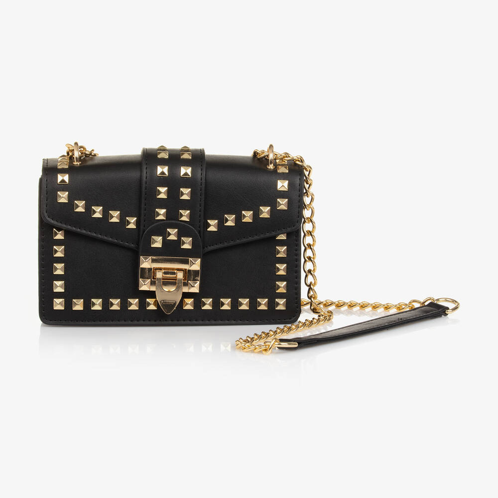 Cool black faux leather shoulder bag for girls from H.Love by Fun & Fun. The compartment is separated into three sections for easy organisation and gold studs on the front give an edgy alternative finish.