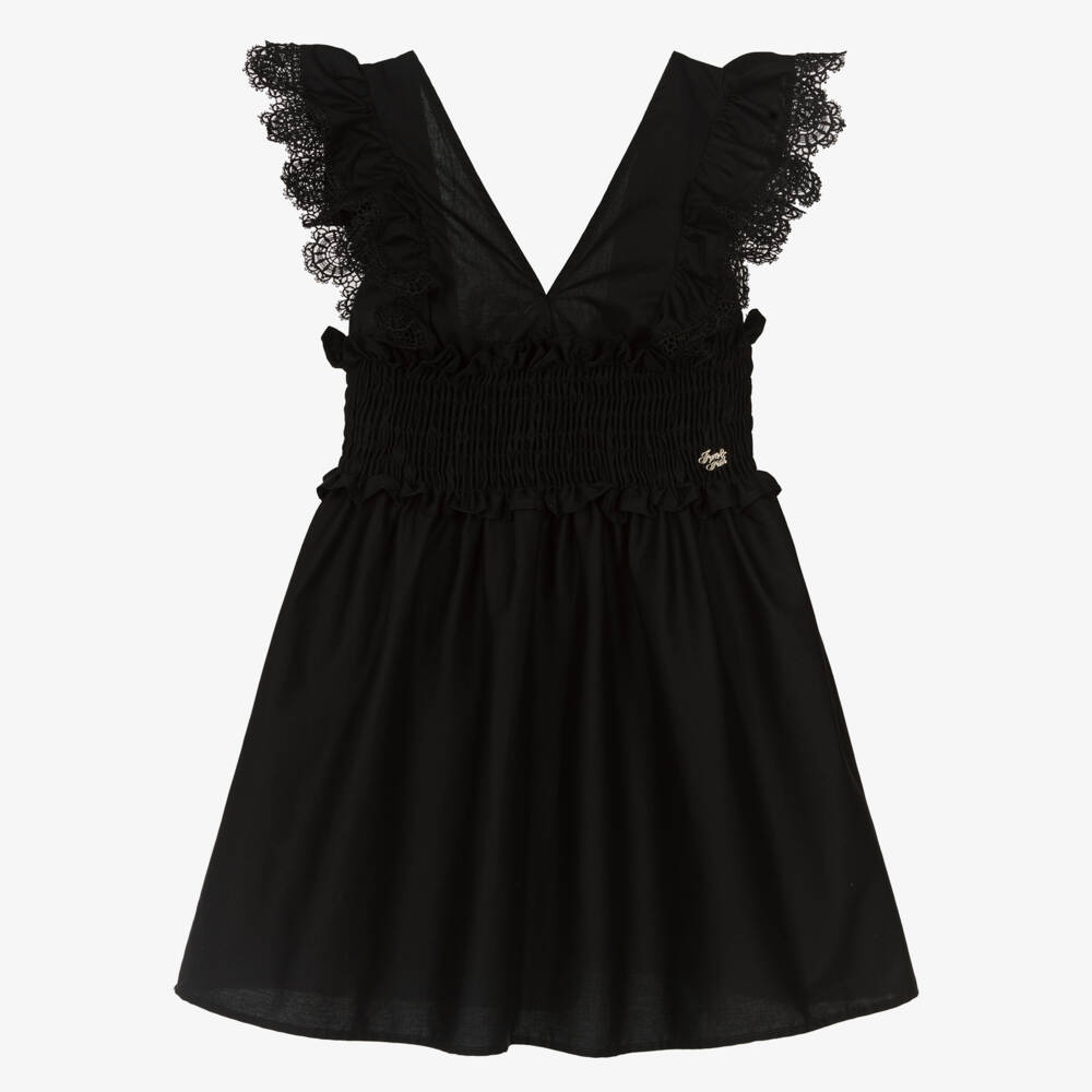 An elegant black cotton blend dress for girls by Fun & Fun. There is a V-shaped neckline and lovely lace trim on the shoulder straps, creating a ruffled effect. The waistband is shirred and stretchy for fit, with a full and flared skirt that is gathered at the waist.