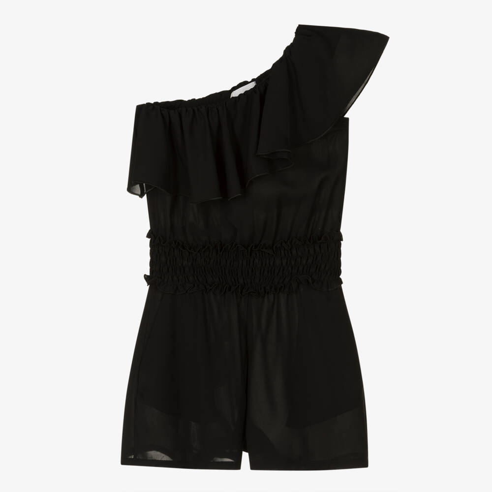 A stylish black chiffon playsuit for girls by Fun & Fun, in a one-shouldered design with a stretchy ruffled neckline. Silky soft and floaty, it has useful front pockets and a shirred waist for extra comfort and an elegant silhouette.