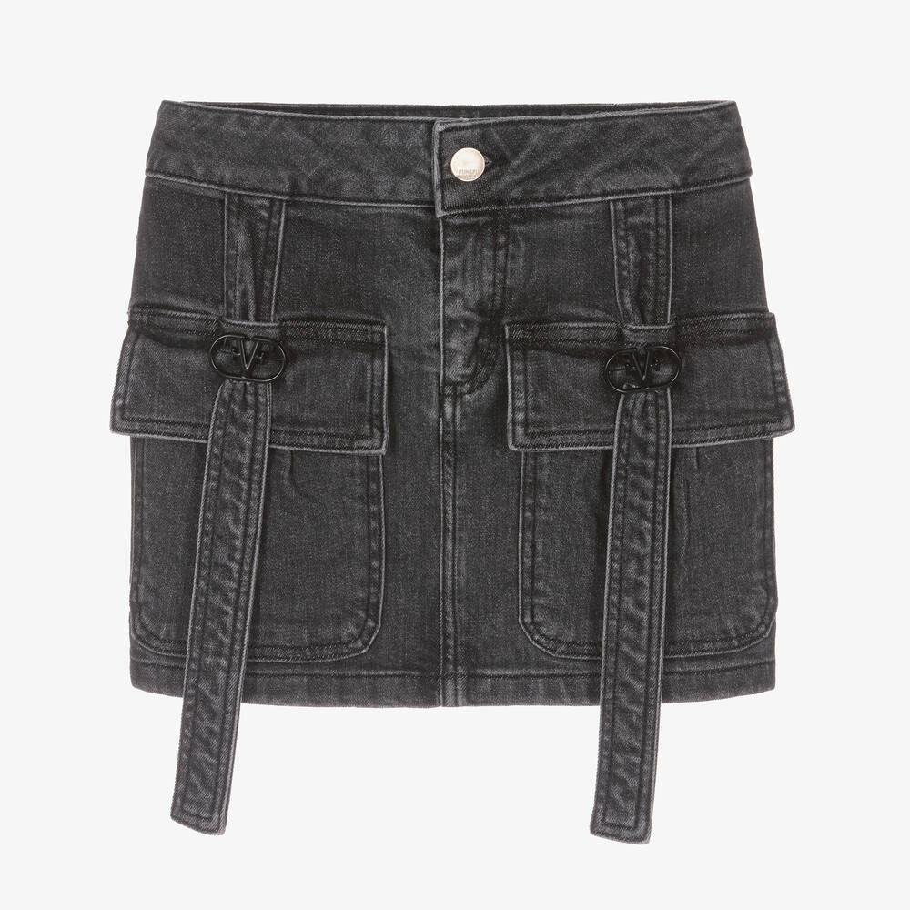Dark grey wash denim skirt for girls by Italian brand Fun & Fun, with added stretch for comfort. This stylish design has large flap pockets on the front, with strap detailing and detachable metal logo pins for brand recognition. There is an adjustable waist for an ideal fit, with a button and zip fastening on the front.