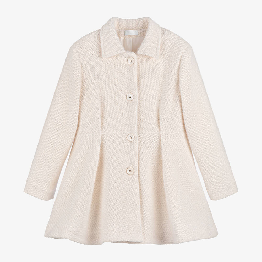 Elegantly styled, this ivory coat for older girls is by Fun & Fun. Ideal for the cooler weather, this warm, knitted coat has a beautifully soft feel and a silky lining for extra comfort. With a lovely fit and flare silhouette, it has a pointed collar and neat button fastenings.