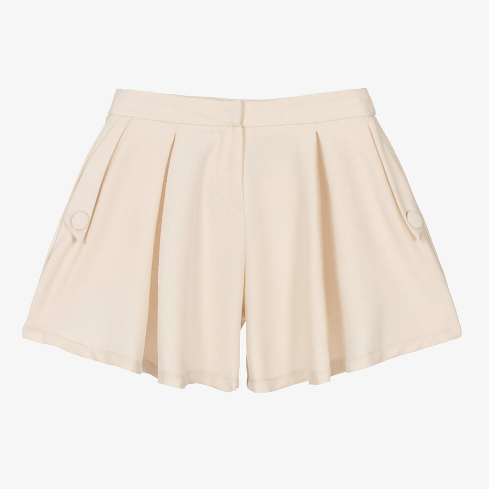 Smart dark ivory shorts for girls by Italian brand Fun & Fun, made in soft twill. Beautifully flared, they have inverted pleats on the front and back, with decorative, fabric-covered buttons on the side pockets. They fasten with a concealed front button and zip and have an adjustable waist.