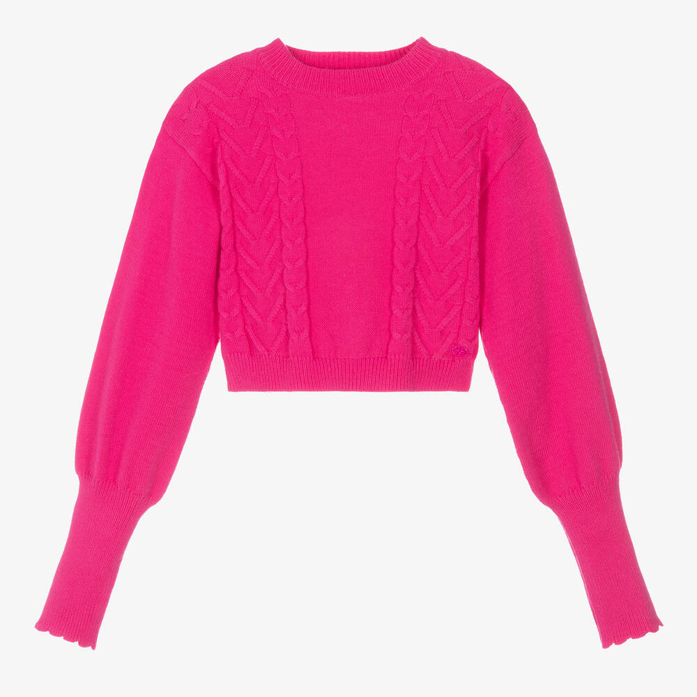 Vibrant fuchsia pink sweater for girls by Italian brand Fun & Fun, cropped in style with a cable knit pattern and deep, ribbed, scalloped trims on the full, long sleeves. Made in a super soft, viscose blend, it has a gold metal logo charm sewn by the hemline.