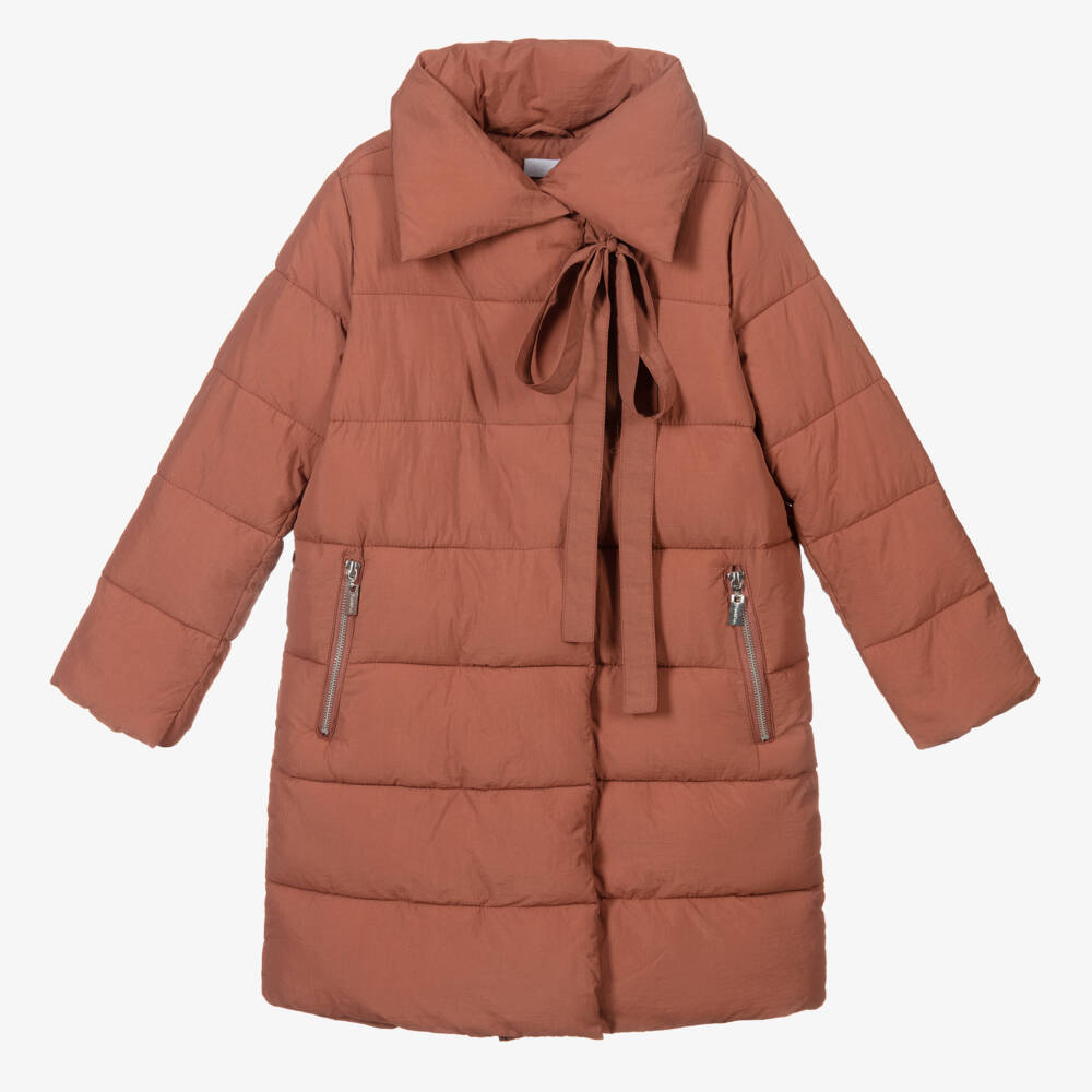 Girls pretty puffer coat in terracotta pink by Italian brand Fun & Fun Chic. Made in lightweight nylon with mid-weight padding, it has a zip fastening hidden under a popper fastening flap. There are zipped pockets on the front. The ties under the collar can be made into a bow to give the coat a lovely finishing touch.