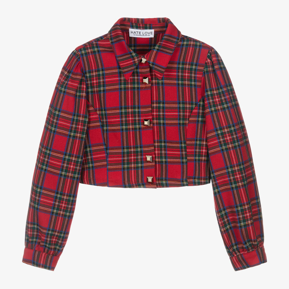 A red tartan blouse for older girls from H.Love by Fun & Fun, made in a viscose blend twill with a soft brushed feel. In a modern boxy fit, it has puffed long sleeves and a pointed collar. It fastens with gold square-shaped buttons, giving the design a stylish finish.