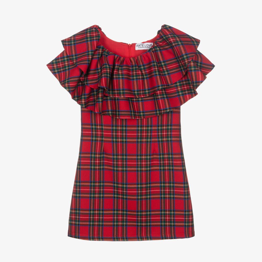 A stylish red tartan dress for older girls from H.Love by Fun & Fun. It is made in soft viscose blend twill with a soft brushed feel. It features an oversized, layered ruffle around the neckline and is designed in a slight A-line shape. This fitted dress is fully lined for comfort and fastens with a concealed zip on the back.