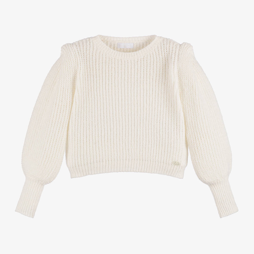 In a lovely off-white shade, this beautifully soft Fun & Fun jumper for girls is made in a cosy yet lightweight mohair blend. It is knitted with a ribbed pattern and has stylish blouson sleeves with deep ribbed cuffs and pleat detail on the shoulders. Shorter in length to sit on the waist, it has a shiny gold-tone logo charm above the ribbed hem.