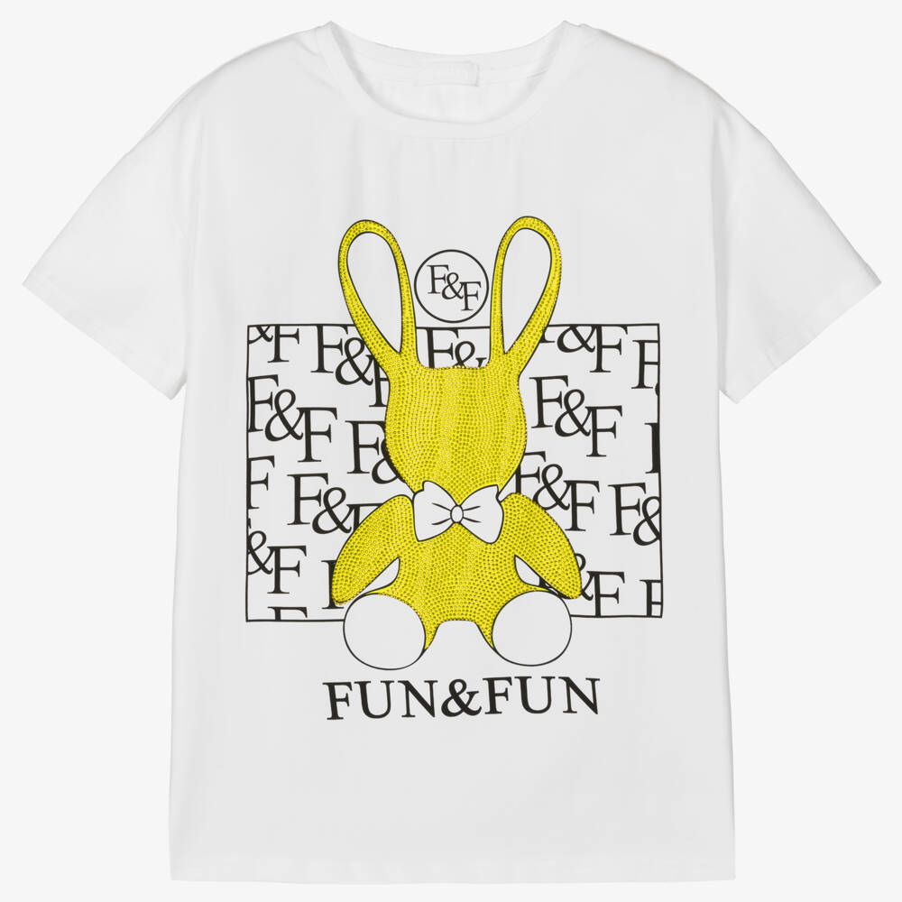 White crew neck T-shirt for girls, by Fun & Fun, made in soft cotton jersey. Long in length, it has a black logo print with an oversized yellow bunny graphic on the front, embellished with rhinestones for added sparkle.