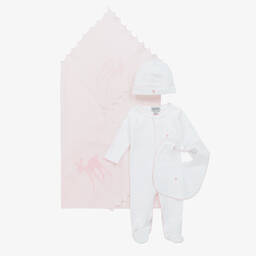 Beautiful white and pink set for baby girls by G.H.Hurt & Son, ideal for gifting and presented in a lovely box. Soft against the skin, the modal and organic cotton jersey babygrow, hat and bib feature a sweet Fawn print. Timeless and classic, the wool shawl has hand-finished scalloped edges and a matching knitted Fawn pattern.