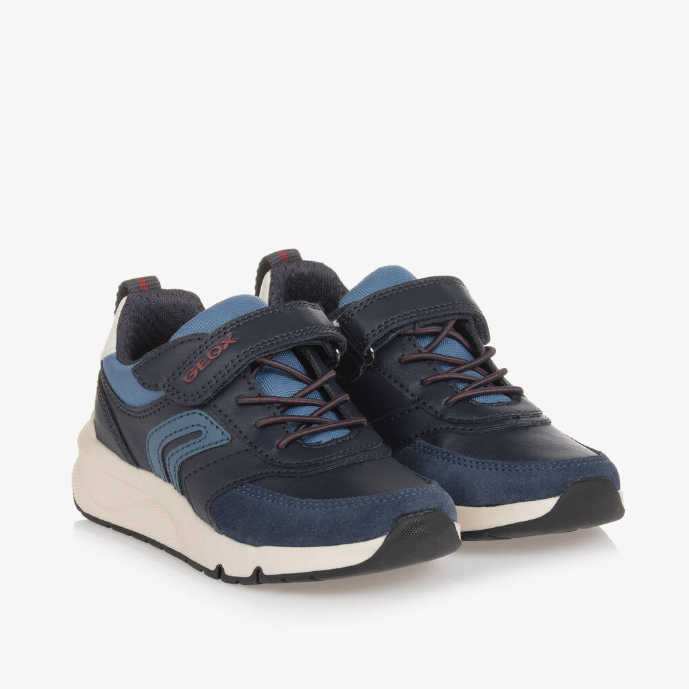 Navy blue trainers for boys by Geox, in sports mesh and faux leather. Easy to pull-on, they have elasticated laces, a velcro-fastening strap and heel pull-tab. Ergonomically designed and super lightweight for comfort, they have breathable and removable fabric insoles. The rubber outsoles, made in the label's bespoke Respira perforated material, have breathable-yet-waterproof qualities for thermoregulation. They are signed with ivory branding on the strap.