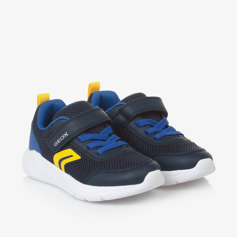 Navy blue mesh trainers for boys by Geox, with smooth faux leather trims. Both comfortable and lightweight, this sporty style has bright blue and yellow detailing for a fun pop of colour. Featuring the brand's signature Respira technology, they are lined in lightly padded soft mesh, with a breathable, shock-absorbing insole and waterproof, non-slip rubberised outer sole. The elasticated laces and heel pull-tab ensure they slip on easily and for a secure fit, they fasten with a branded velcro strap.